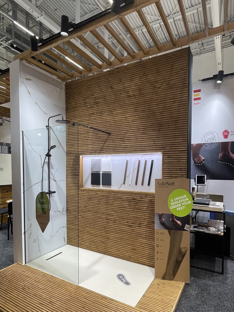 SolidSoft est exposé au salon international ISH avec un nouveau concept de stand organique exposant le produit avec des matériaux naturels tels que le bois qui se combinent parfaitement.